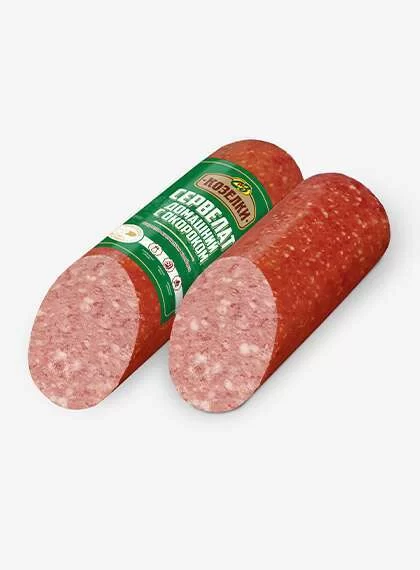 Сервелат «Домашний с копчёной грудинкой» – варено-копчёный продукт для ценителей насыщенного вкуса. Кусочки мелко рубленой копчёной грудинки придают особую пикантность и аромат дымка. Нежная свинина, мясо цыпленка и пикантный чеснок создают гармоничное сочетание. Прекрасно подходит для закуски, бутербродов или мясной тарелки. Натуральный, сочный вкус – попробуйте по-новому.