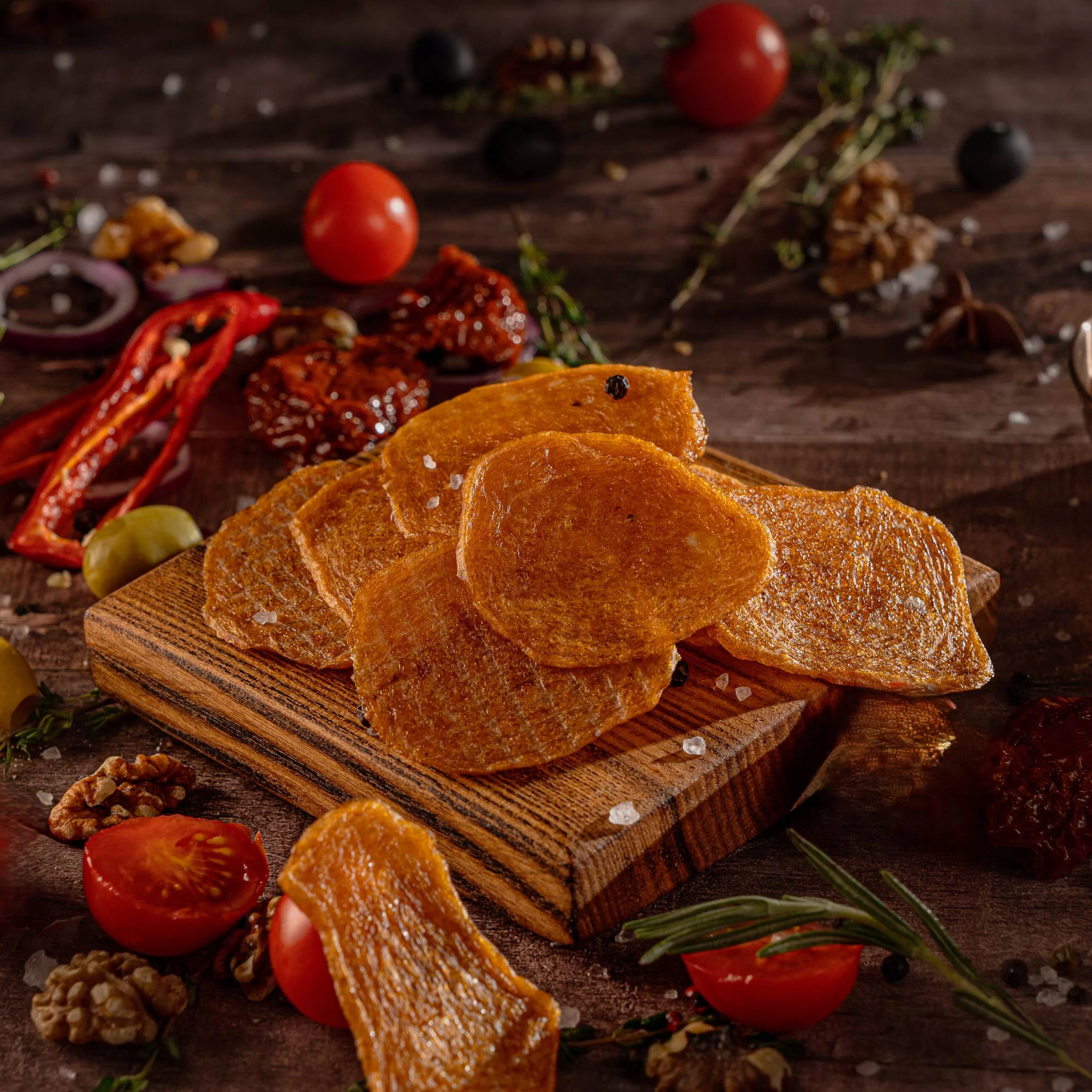 Ароматные чипсы из мяса птицы, изгнотавливаются из нежнейшего куриного мяса, приправленного изысканными натуральными добавками в виде пряностей и специй. Приятный аромат копчения делает вкус чипсов более ярким и пикантным, благодаря чему продукт получил огромную популярность.