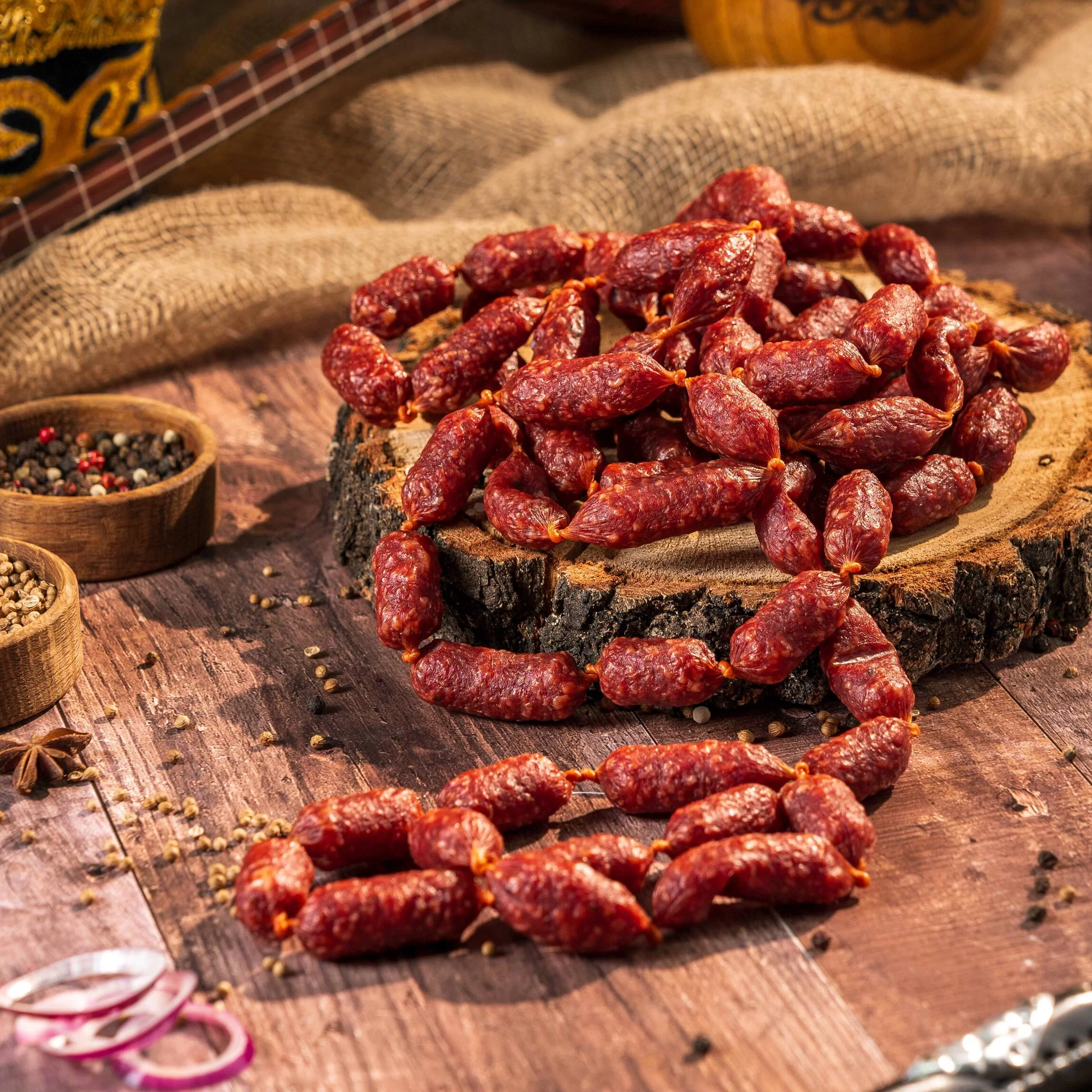 Свинина, шпик, говядина, филе куриное, посолочная смесь, пряности чеснок, лук, перец, кориандр, паприка, перец красный.