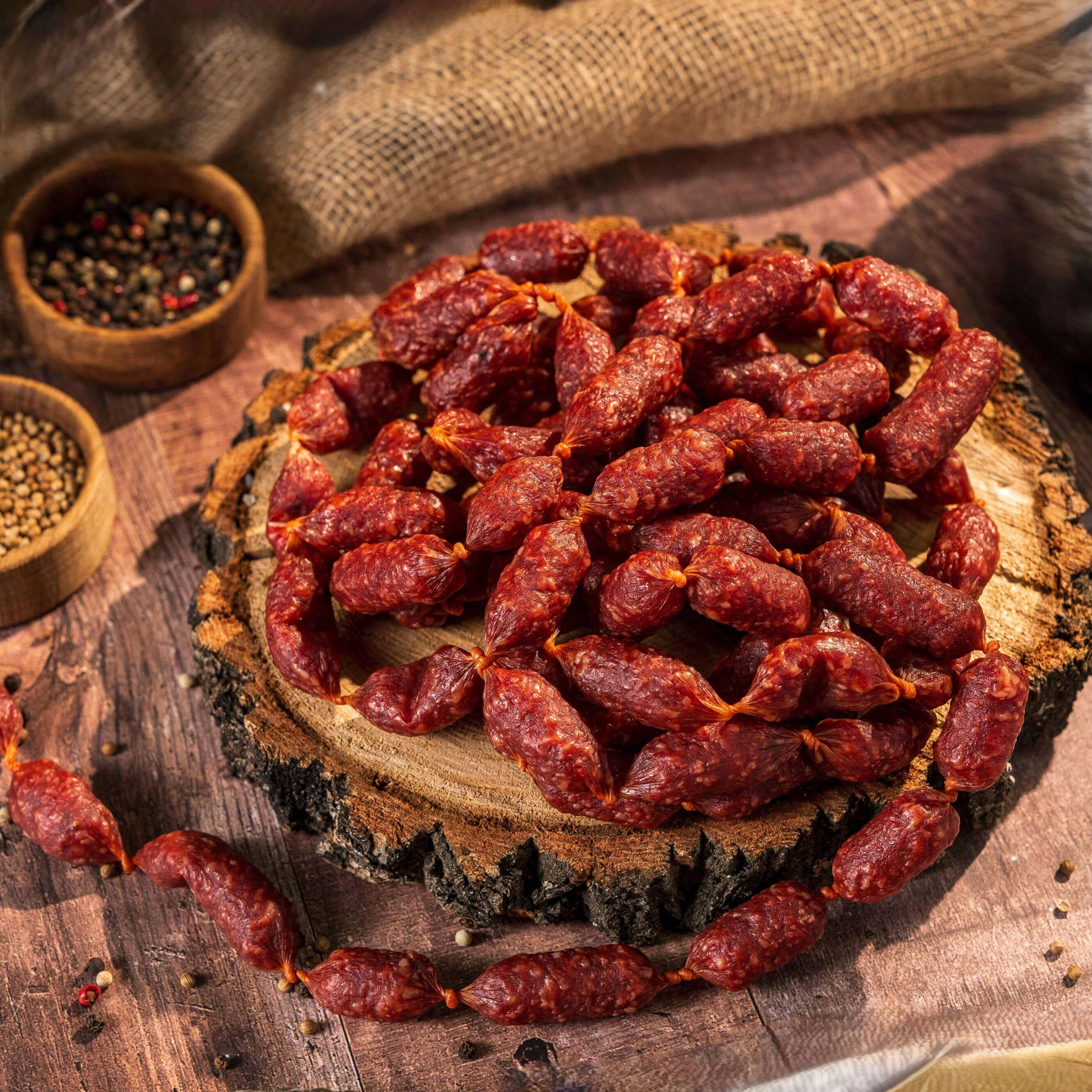 Пралине колбаски - это отличный вариант для закусок на любом празднике или вечеринке! Основные ингредиенты, такие как свинина, шпик, говядина и куриное филе, создают насыщенный и сочный вкус. Посолочная смесь и пряности, включая чеснок, лук, перец, кориандр и паприку, придают им аромат и пикантность.
