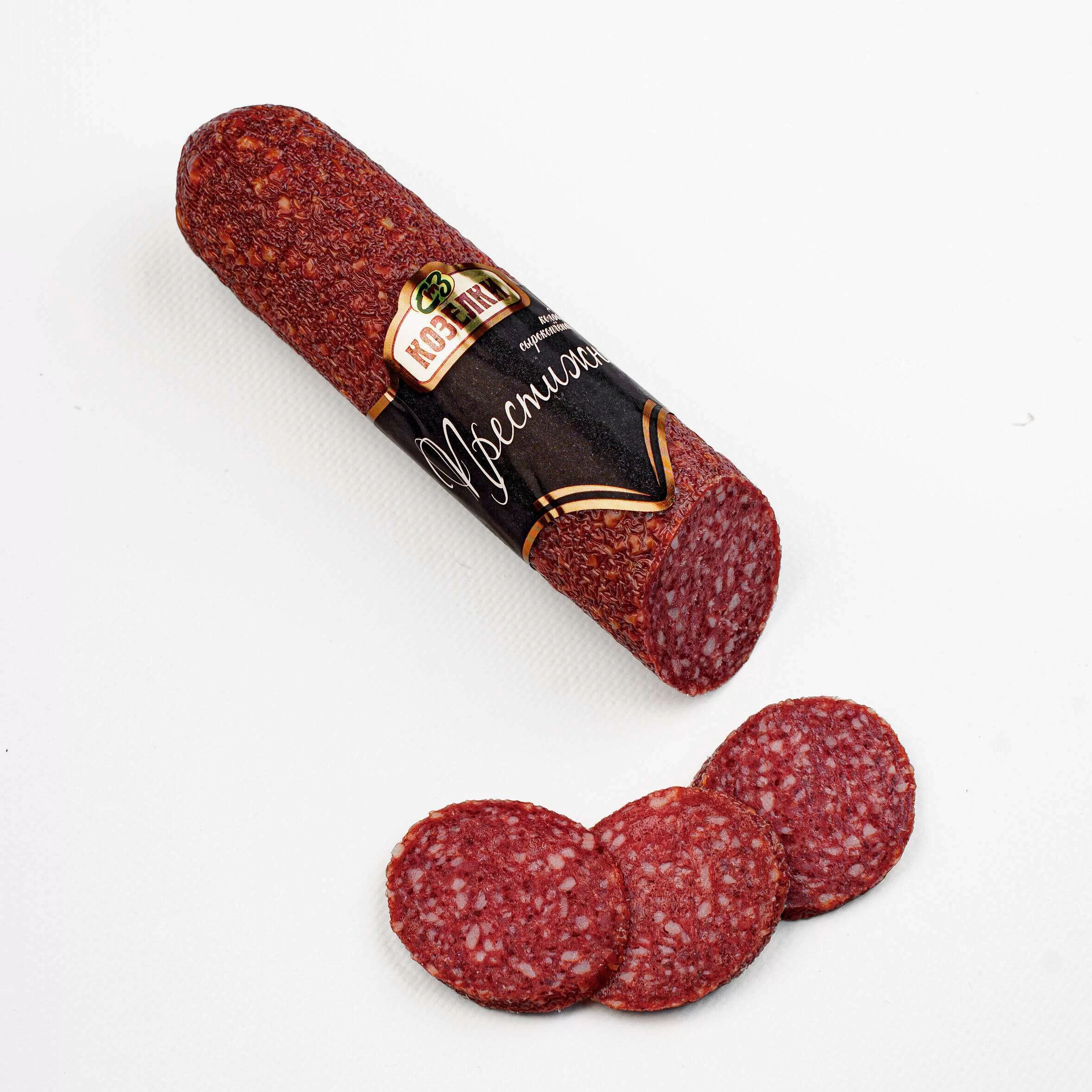 Колбаса "Престижная" - традиционный сырокопченый продукт с мелкозернистой структурой. Отборная свинина и куриное филе, нежный шпик и уникальная смесь ароматных пряностей создают утонченный вкус и великолепный аромат.