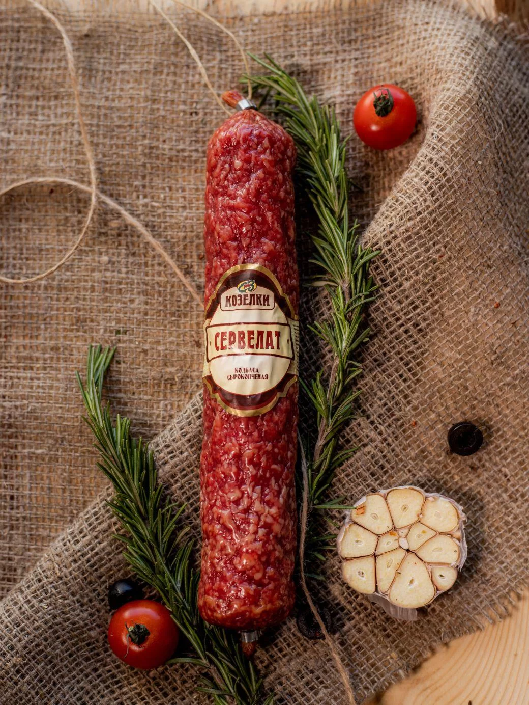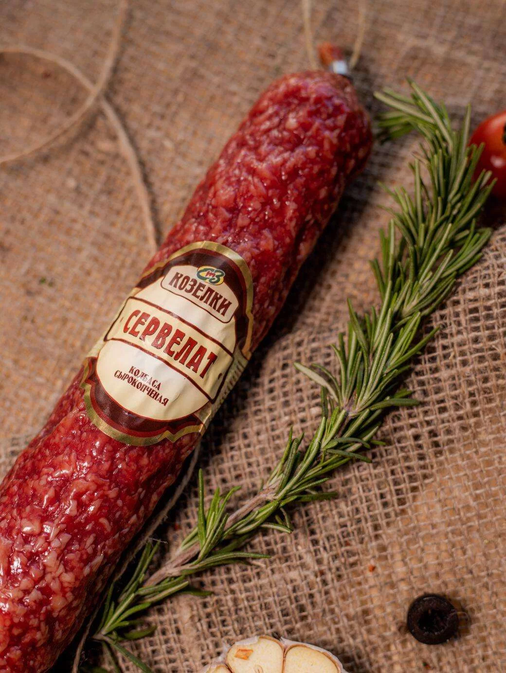 Сервелат изготавливается из говядины высшего сорта, свинины и шпика, обладает очень красивым рисунком на срезе с четкой структурой,