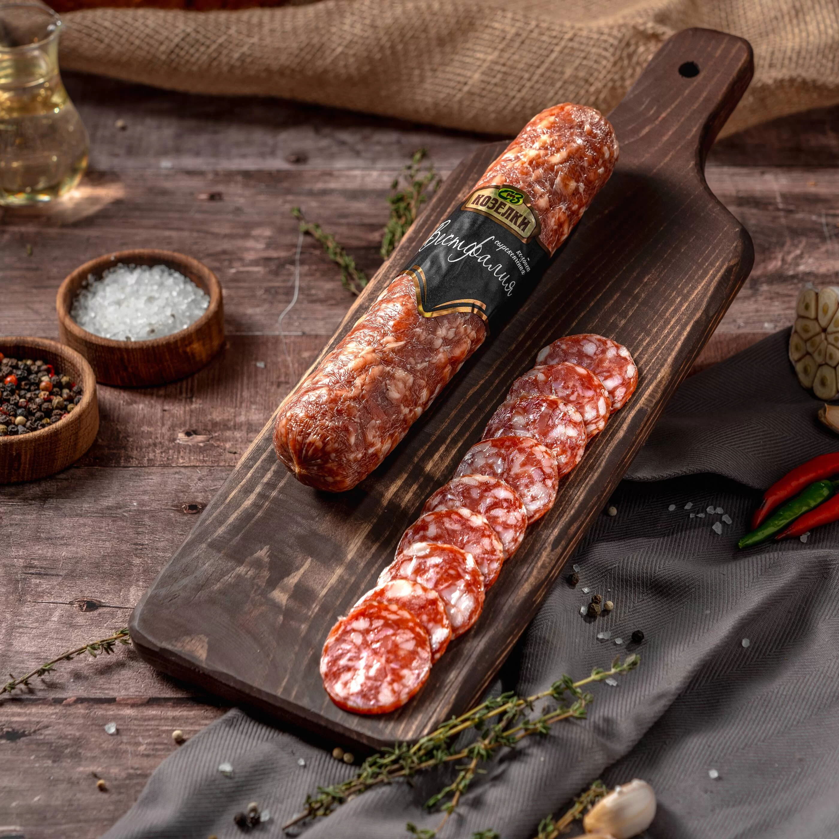 Изысканный вкус и аромат этой сырокопченой колбасы обусловлен оптимальными пропорциями мелкорубленного шпика и отборной свинины, а также сбалансированностью специй. Рецептура продукта включает целую гамму пряностей: мускатный орех, черный перец, чеснок и гвоздика.